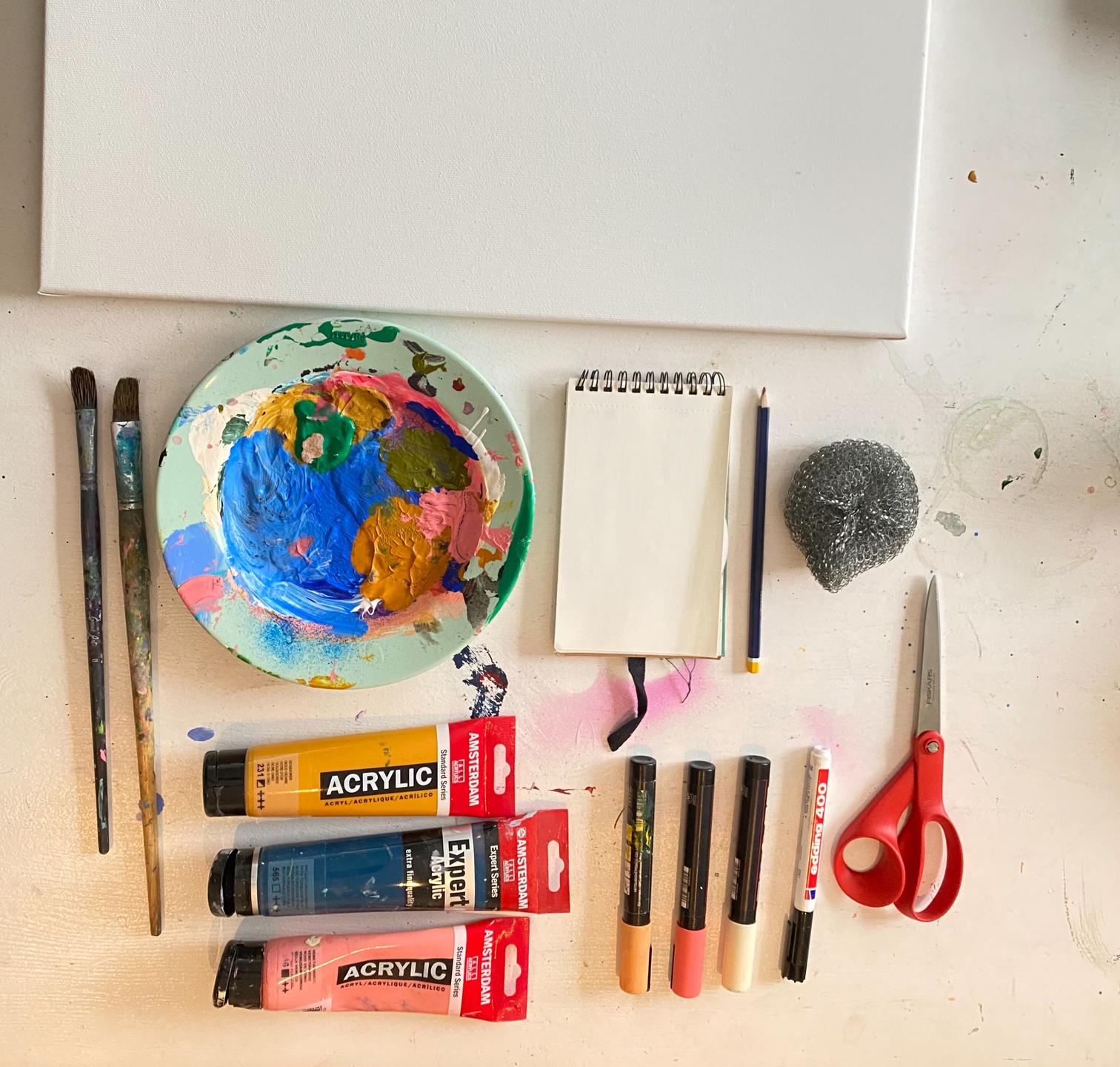 *4-5 akrylfarver (farver er blot dem du har ellers ville jeg gå med disse: ultra marine blå, gul, rød og evt. okker + sort/hvid)